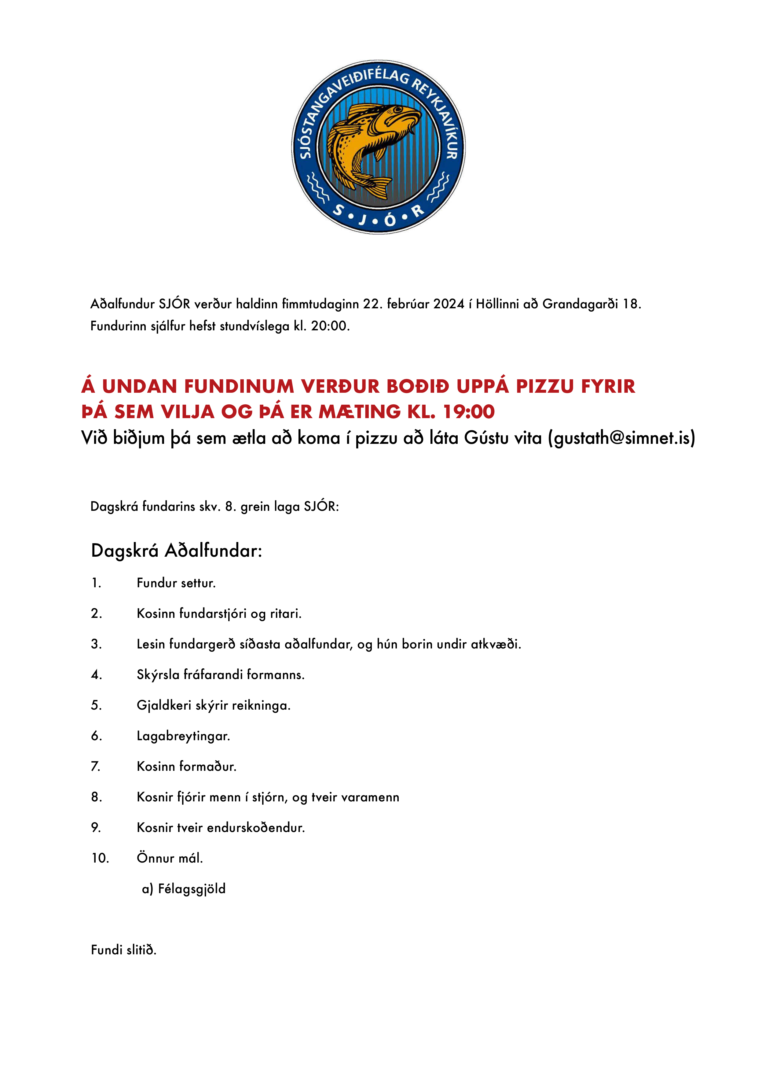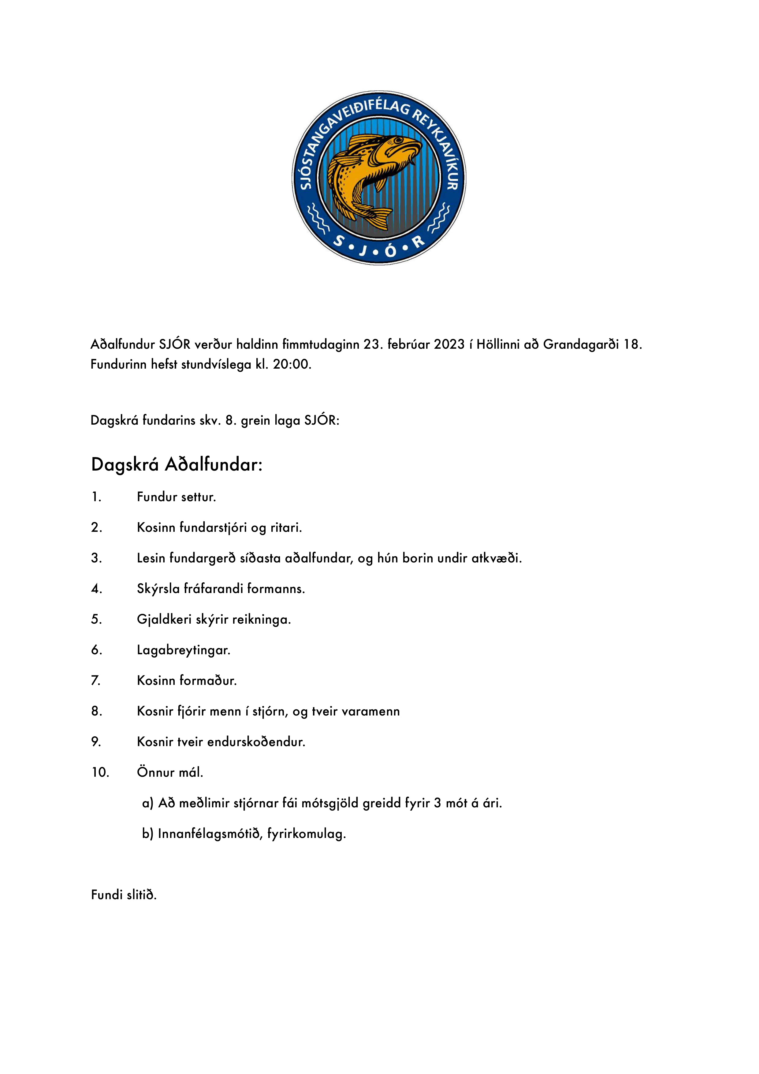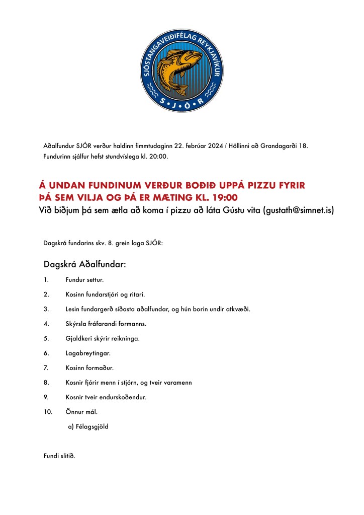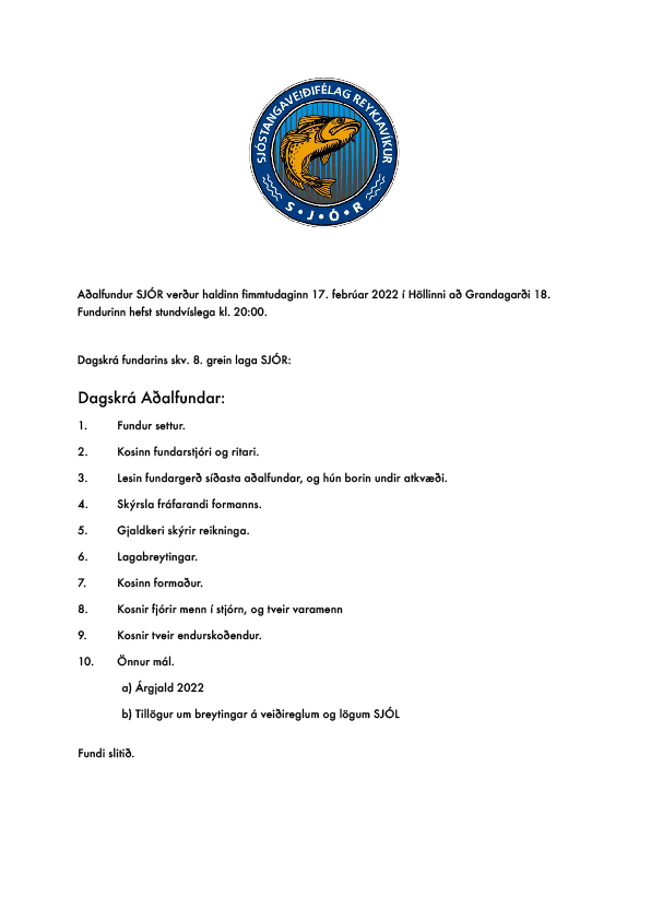 Mynd Höfundur: sjorek2014 Skrifað þann 06/02/2023 Birt undir Óflokkað ummæli Skrá ummæli AÐALFUNDUR SJÓR, 23. FEBRÚAR 2022, KL. 20:00 Deila: Click to share on Facebook(Opnast í nýjum glugga) Facebook