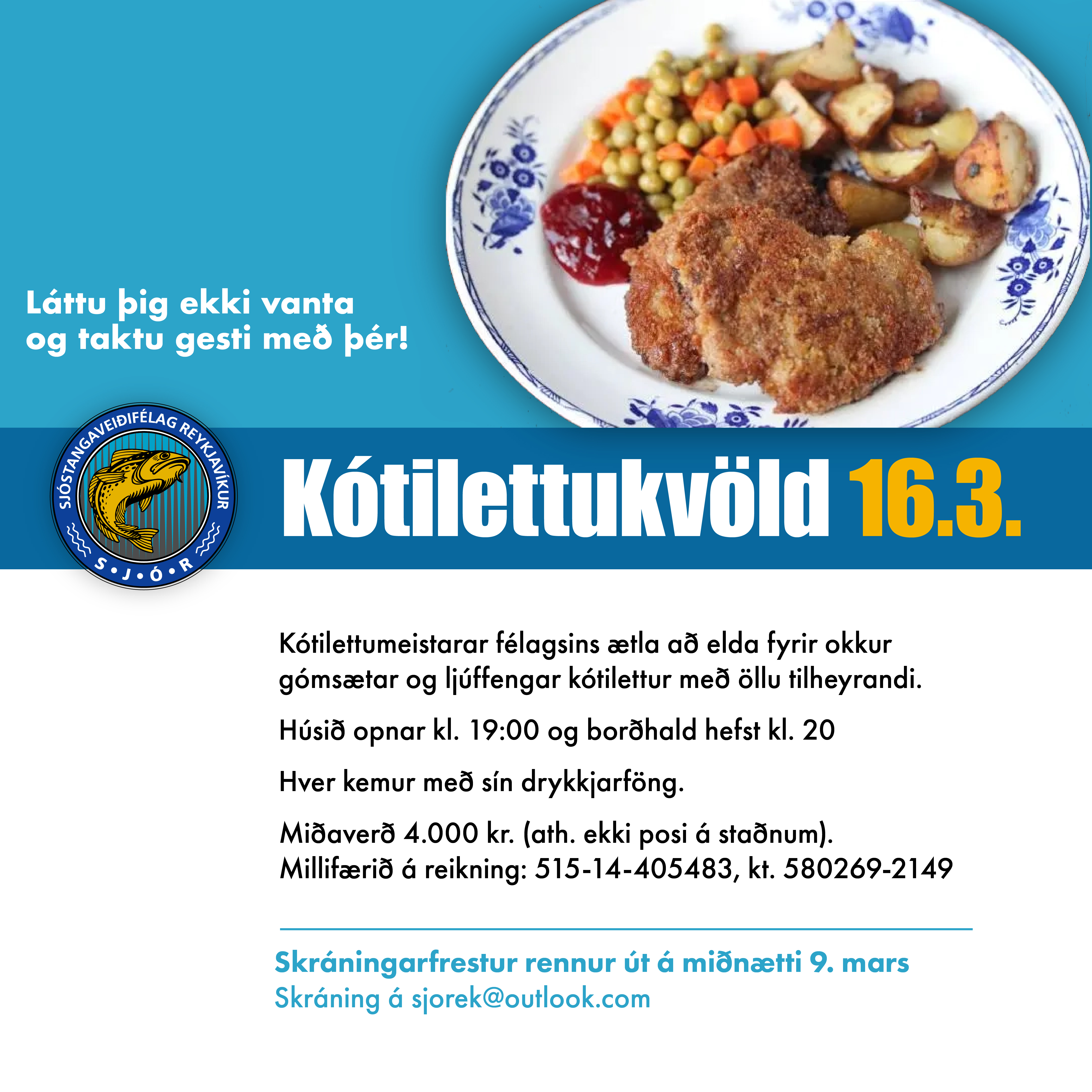 Mynd Höfundur: sjorek2014 Skrifað þann 17/03/2023 Birt undir Óflokkað ummæli Skrá ummæli Kótilettukvöld 31 mars – ATH. breytt dagsetning KÓTILETTUKVÖLD – SKRÁNING Deila: Click to share on Facebook(Opnast í nýjum glugga) Facebook